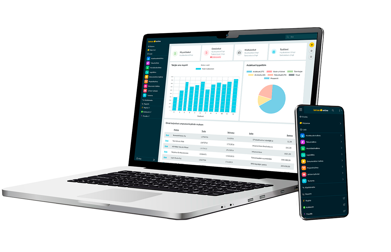 Lue lisää ratkaisustamme asiakkuudenhallintaanLemonsoft ERP auttaa pk- ja keskisuuria yrityksiä hallitsemaan koko liiketoimintaa yhdestä järjestelmästä ja rakentamaan kannattavaa kasvua luotettavan, kotimaisen ratkaisun avulla.